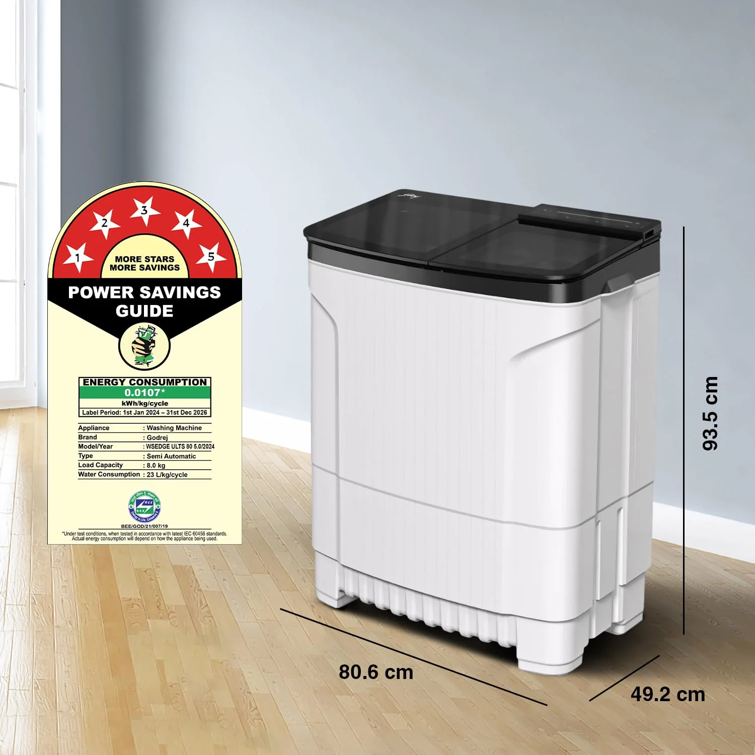 – Semi-automatic washing Machine: Economical, Low water and energy consumption, involves manual effort; Has both washing and drying functions – Capacity 8 kg: Suitable for large families – Energy Rating: 5 Star – Best in class efficiency, ensuring reduced electricity consumption – Warranty : 5 Year Warranty on Wash Motor and 2 year Warranty on Entire Washing Machine – 1440 RPM : Higher spin speed helps in better water extraction from the clothes during the spin cycle, resulting in faster drying – Wash Programs: 2 wash program – Regular, strong | Panel – Water protected rear control panel – Pulsator type & Body material – Tri-Roto Scrub Pulsator & Rust Proof Poly-Propylene Body – Key Features : 460 W PowerMaxx Wash Motor | Toughened glass lid | Wash upto 8 king bedsheets – Special features – water level indicator | Spin Shower | Cartridge Lint Filter | Water Protected Rear Control Panel | Electromechanical Functioning | Ribbed walls for scrubbing action | Soft Shut Lid | Strong Wash Program | 35 minutes wash time | end of cycle buzzer | active soak upto 20 mins – Included In The Box: 1 Semi Automatic Washing Machine, User Manual and Warranty card
