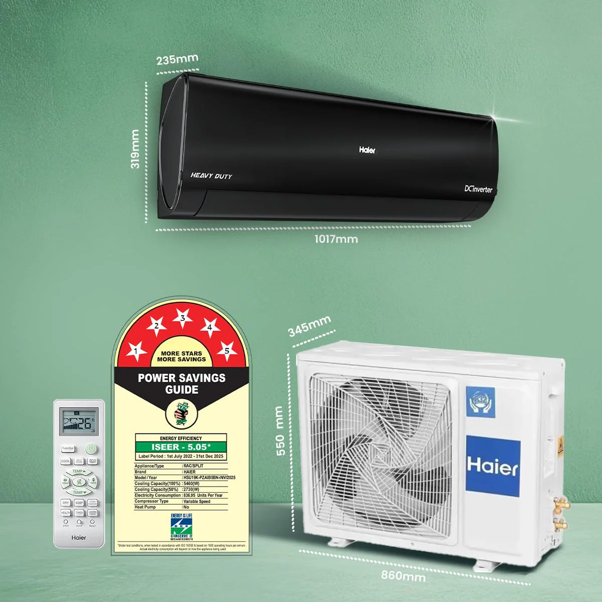 – 1.6 Ton 5 Star Smart Split AC with Hexa Inverter Compressor: Heavy Duty Full DC 1.6 Ton air conditioner designed for Indian climate. The 7-in-1 cooling mode allows capacity control (40% to 110%), saving up to 60% energy compared to other 1.5 Ton Split ACs – Capacity: 1.6 Ton; 5460 watts. Suitable for Medium to Big sized rooms (111 to 180 sq.ft) | Air Circulation: 1200 CFM | Supersonic Cooling in just 10 Seconds even at 60°C high ambient temperature which give you optimum cooling even in the hottest days – Energy Rating: 5 Star | ISEER: 5.05 | Annual Energy Consumption: 837 KWH |Frost Self Clean: Complete indoor wet wash in just 21 minutes with press of a button. Service engineer type cleaning that offers, 99.9% clean air and removes any odour, dust and bacteria. Note: The current star rating is based on the 2025 BEE guidelines. Under the new 2026 BEE guidelines (effective from 1st Jan 2026), this product will be rated one star lower. – Manufacturer Warranty: 5 years on the product and 12 years on the compressor (4-year promotional warranty post-installation). Installation by Haier/authorized centers & 2 maintenance services (paid) yearly is mandatory. T&C apply; excludes gas/plastic parts – Copper Condenser Coil: 1.6 ton split AC with 100% copper coil offers better cooling, durability, and longer life. Hyper PCB and flame-resistant materials ensure protection from power surges and fluctuations. – Key Features: Frost Self Clean | Supersonic Cooling in Just 10 Sec | HEXA Inverter | Optimum Cooling at 60C High Temperature | Hyper PCB for Stabilizer free Performance | Upto 20 Mtrs Air throw | 7 in 1 Intelli Convertible | AI Smart AC | 4-Way Air Swing | Expandable | Upto 33% extra Air Circulation | Super Micro Anti Bacterial Filter | Super Anticorrosion| Energy Efficient| ECO & Turbo Mode | Super Quiet Mode | Dark Mode | Hidden Display | Low Gas Warning – Haier AI Climate Control: Smart, Efficient, Personalized. | Power Tracking: Monitor energy use with detailed hourly-to-monthly insights. | AI ECO: Auto-adjusts for peak efficiency and energy savings. | AI Climate Assistant: Learns your habits for perfect, personalized comfort. – Refrigerant: R32 Refrigerant has been used which is environment friendly and has No Ozone Depletion Potential and Low Global Warming Potential | AI Smart AC Features: Control your AC remotely via the Hai Smart App. Track power usage, set targets. Optimize energy with AI ECO mode. AI Climate adjusts cooling based on your preferences from the past 7 days. Remotely turn the AC on/off, adjust temperature, monitor status, manage sleep profiles, switch modes, and use voice control with Alexa or Google. – Dimensions & Weight: Indoor Unit IDU (l*b*h mm)- 1017*235*319 Weight (Kg)- 13 | Outdoor Unit ODU (l*b*h mm)- 860*345*550 Weight (Kg)- 32 – Shipment includes: 1 Indoor Unit, 1 Outdoor Unit, Remote, 3m Copper Tube, 3.5m Power Cord. Note: Brand Warranty can be availed using amazon invoice and User manual can be accessed from brand website.