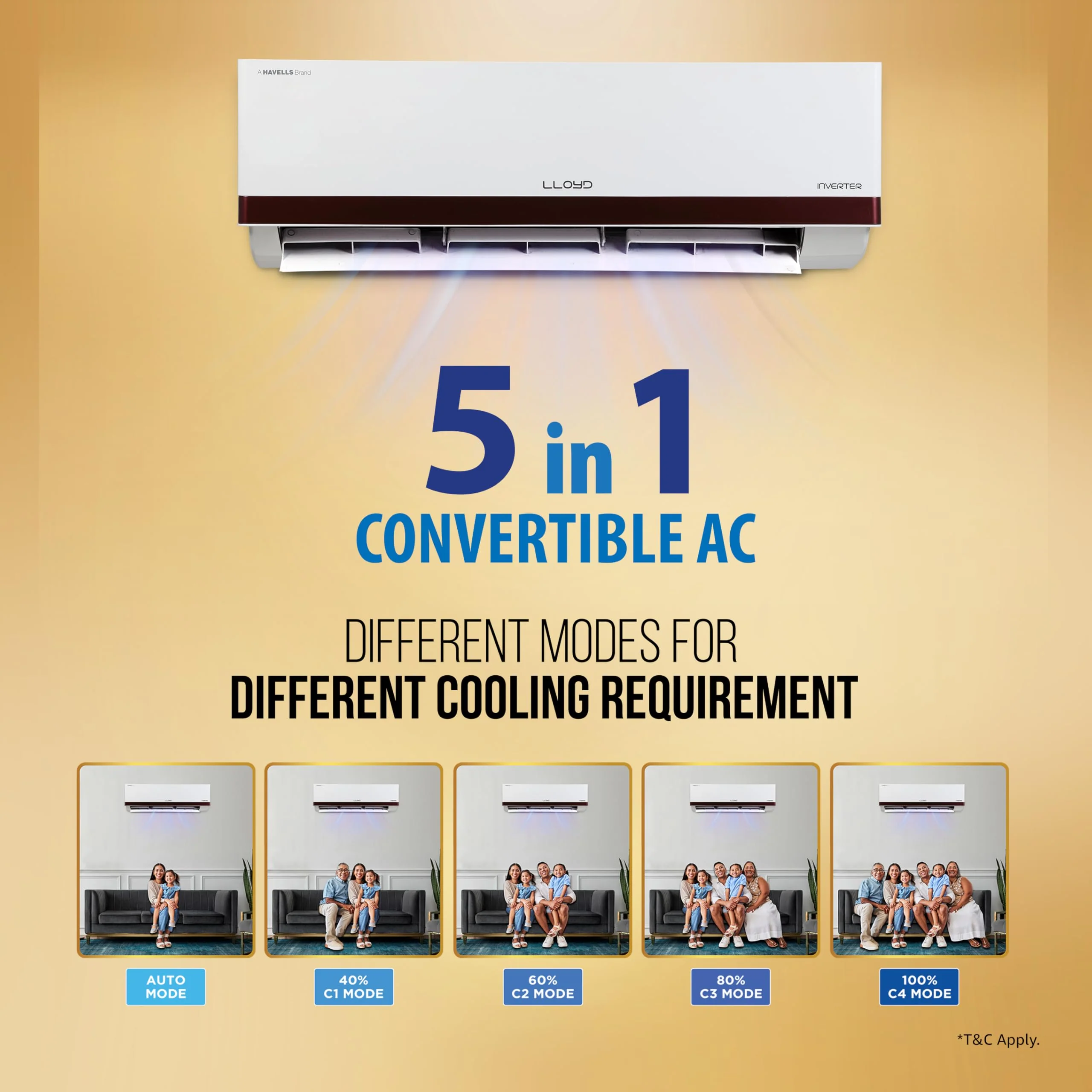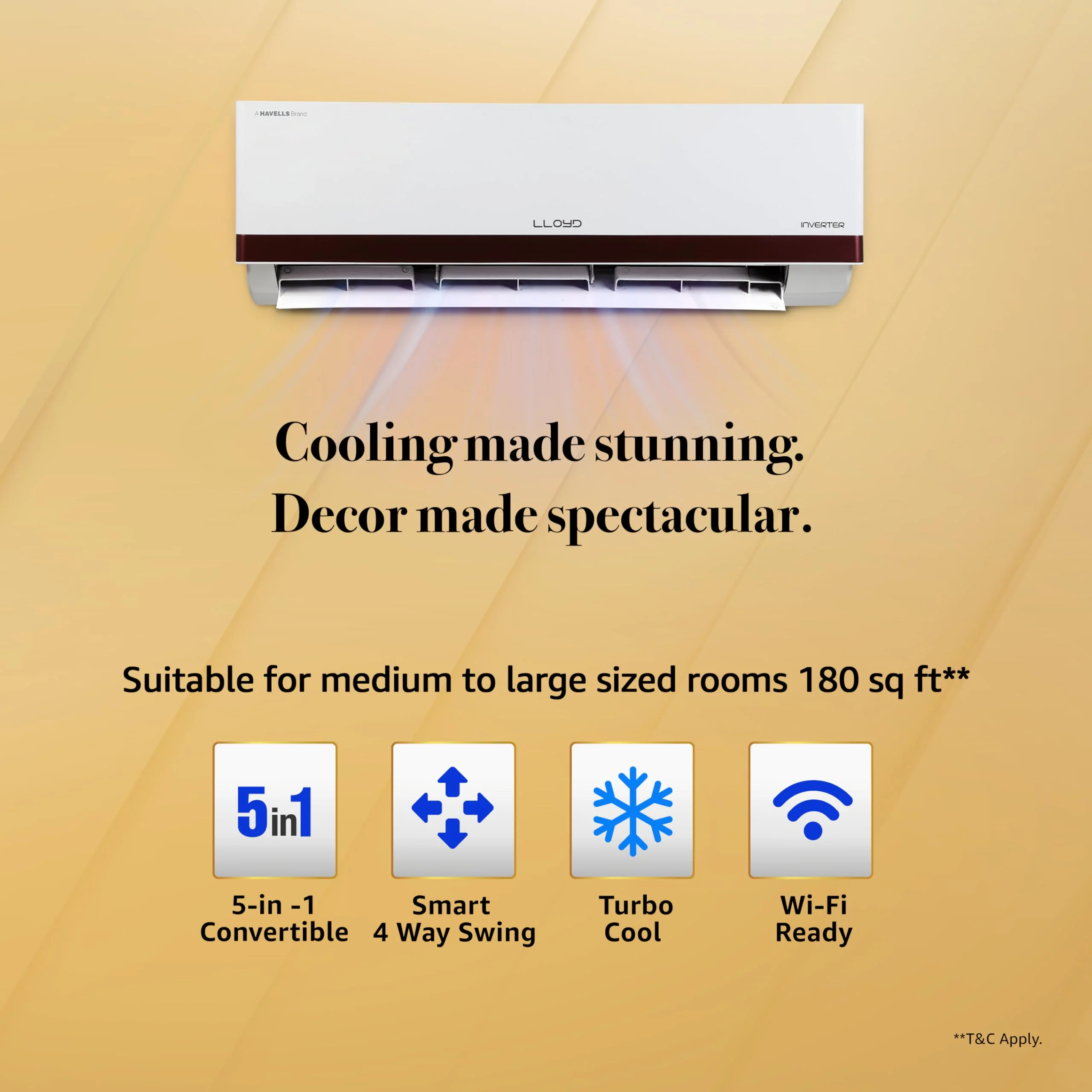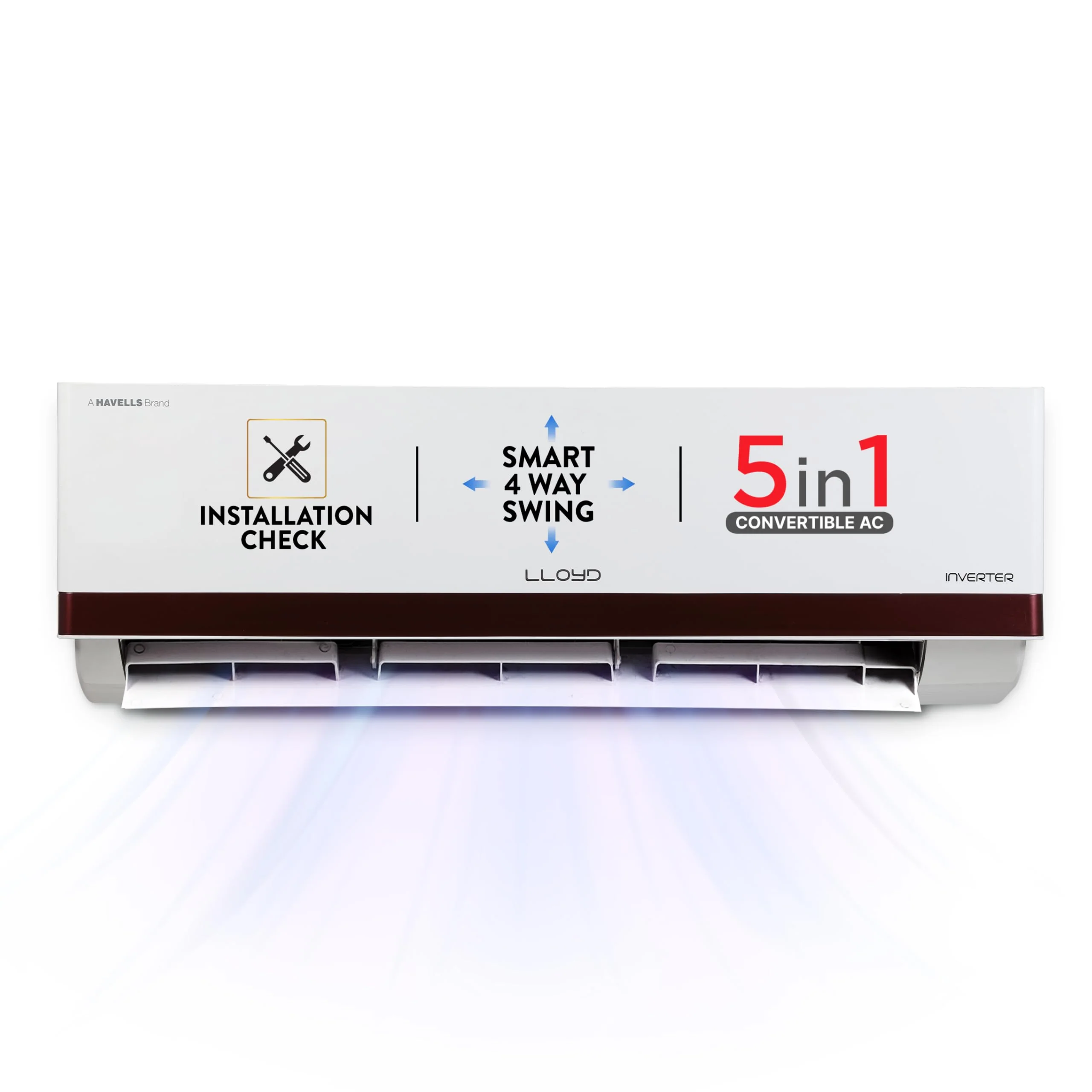 – Lloyd Split AC with Inverter Compressor: AC with variable speed compressor which automatically adjusts power depending on room temperature & heat load. Convertible / adjustable with 5 cooling modes through remote control to operate in different tonnages for different cooling needs (30% to 110% capacity) – Capacity: 1.5 ton suitable for medium size rooms up to 180 square feet – ????✨Note: The current star rating is based on the 2025 BEE guidelines. Under the new 2026 BEE guidelines (effective from 1st Jan 2026), this product will be rated one star lower????✨ Energy Rating: 5 Star, Annual Energy Consumption: 715.07, ISEER Value: 5.2, please refer to energy label on the product page – Manufacturer Warranty: 1 Year on the product, 5 Years on Component (including PCB) and 10 Years on the Compressor, please refer to company website for further details – Golden Fins Evaporator Copper Coils: Ensures better cooling performance, require low maintenance and enhances durability of the product – Key Features: Cools even at Ambient temperature of 52°C with 4 Way Air Swing, Stabilizer Free Operation within 100 – 300 voltage range; Hidden LED Display; Noise Level: IDU – 37 (DB) – Special Features: 5 in 1 Convertible AC that Cools even Cools @ 52°C temperature, PM 2.5 Air Filter, 10m Long Air Throw, Turbo Cool, Low Gas Detection, Clean Filter Indication, Installation Check, Auto Restart on power restoration – Refrigerant: R32 Refrigerant has been used which is environment friendly and has No Ozone Depletion Potential and Low Global Warming Potential – IDU Dimension (L x B x H) in cm: 100 x 22.0 x 32.7 having 11.8 kg net weight and ODU Dimension (L x B x H) in cm: 87.0 x 36.5 x 56.0 having 27.85 kg net weight – Included in the Box: 1 Indoor Unit, Remote & Batteries, User Manual, Drain Pipe, Installation Accessory Kit, 3 metre Connecting Copper Wire, 1 Warranty Card and 1 Outdoor Unit with Installation Pipe