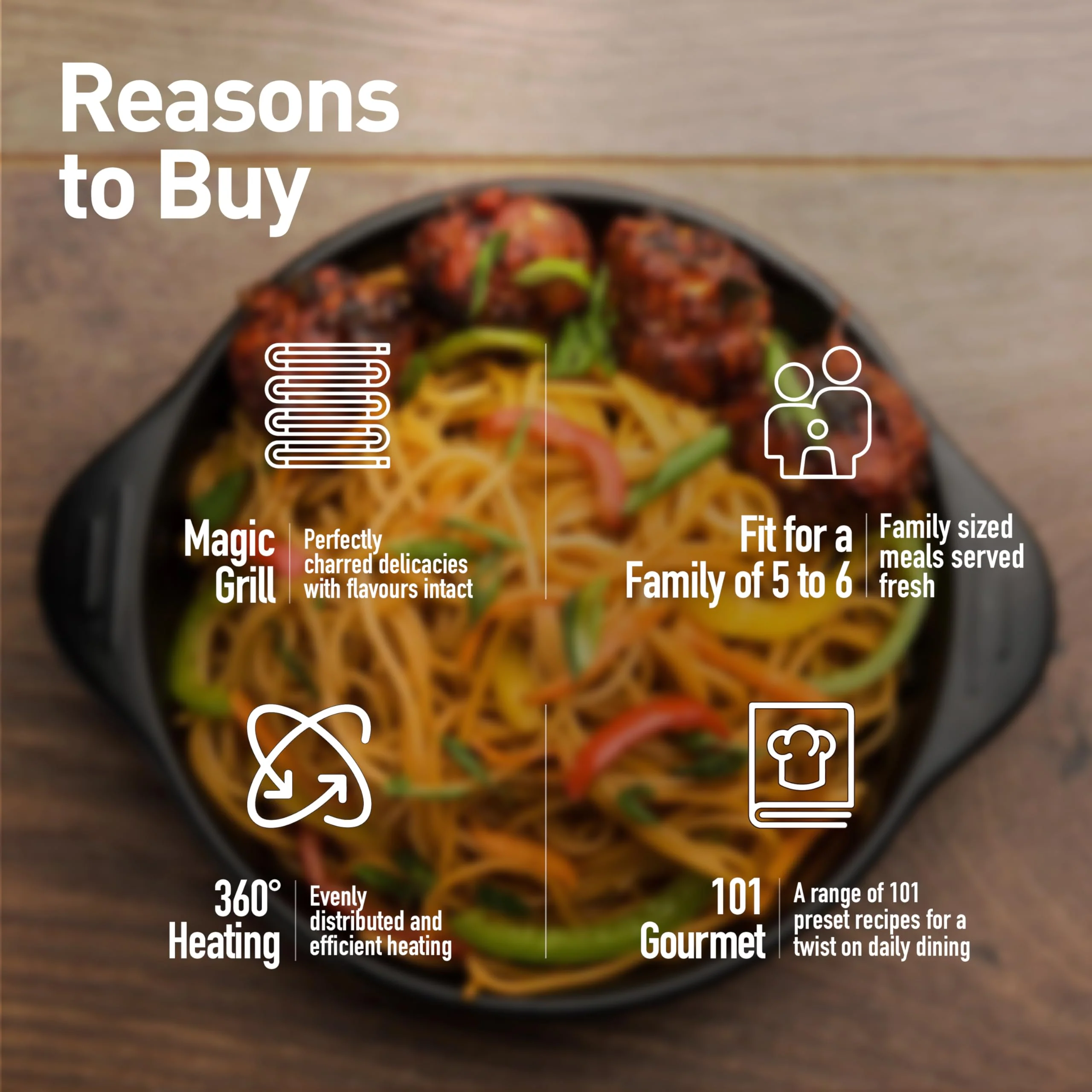 • Energy Consumption: Annual energy consumption 900 Watts – Number of Auto cook menus: Access 61 pre-loaded menus ranging from starters to desserts, to serve up healthy, delicious food every day. – Special Features: Magic Grill Dual power of top and back grill work to make food crispier outside and juicy inside .