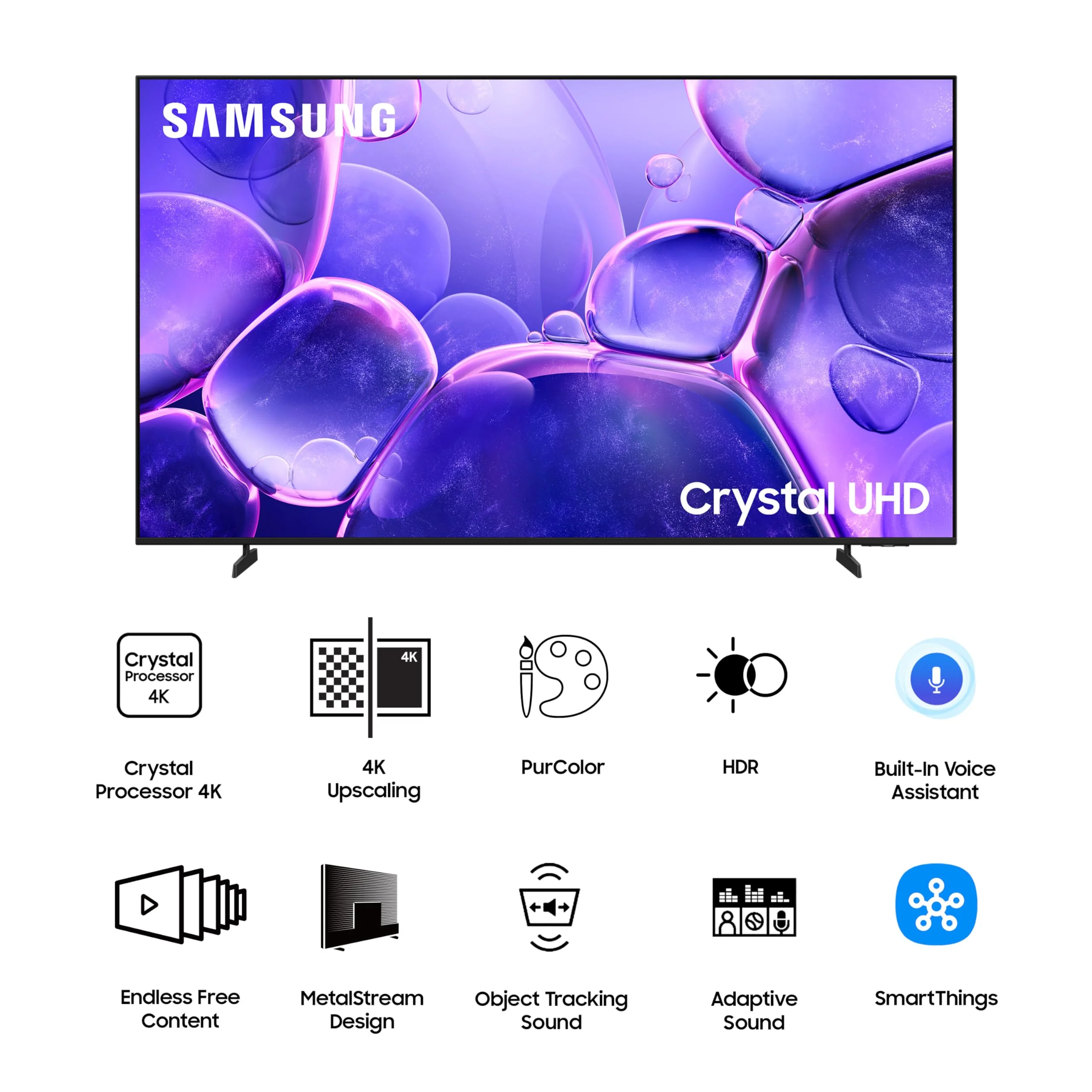Resolution: 4K Ultra HD (3840 x 2160) | Refresh Rate: 50 Hertz – Connectivity: Enjoy seamless integration with 3 HDMI Ports for connecting your Set-Top Box/DTH, Soundbar, Home Theater, Gaming Console, and more. Plus, stay flexible with 1 USB-A Port for easy access to Hard Drives and other USB-compatible devices. Stay connected with Wi-Fi 5, Bluetooth 5.2, and HDMI eARC, along with an Ethernet LAN Port for stable wired internet. Additional features include Anynet+ (HDMI-CEC) for unified control and RF In for Terrestrial/Cable input. – Sound Features: Powerful 20 W Sound Output | Object Tracking Sound Lite | Q-Symphony | Adaptive Sound – Smart TV Features: Built-in Alexa & Bixby | Solarcell powered Remote Control with Voice Assistance | Endless Content with Samsung TV Plus (Access 100+ free TV Channels) | Web Browser | SmartThings Hub | Matter Hub | IoT Sensor Support | Quick Remote | Mobile-to-TV Mirroring | Sound Mirroring | Wireless TV On | Connect Apple Devices with AirPlay | Universal Guide | Workspace for Remote Access | Buds Auto Switch | Workout Tracker | Daily+ | Multi Control | Storage Sharing | Energy Rating: 3 Star | Annual Energy Consumption: 300.03 kWh – Display Features: Crystal Processor 4K | HDR10+ Support | Pur Color | 4K Upscaling | Color Booster | Mega Contrast | Contrast Enhancer | HLG (Hybrid Log Gamma) | UHD Dimming | Motion Xcelerator | HDMI Black Level | Film Mode | Filmmaker Mode | – Warranty Information: 1-year manufacturer warranty and 1 year additional on Panel from date of purchase on the television set and 12-month warranty on the remote control. Warranty claims can be processed using the Amazon e-invoice – Additional Information : Brand Warranty can be availed using invoice. User manual can be accessed from brand website under About this item/ Product details section.