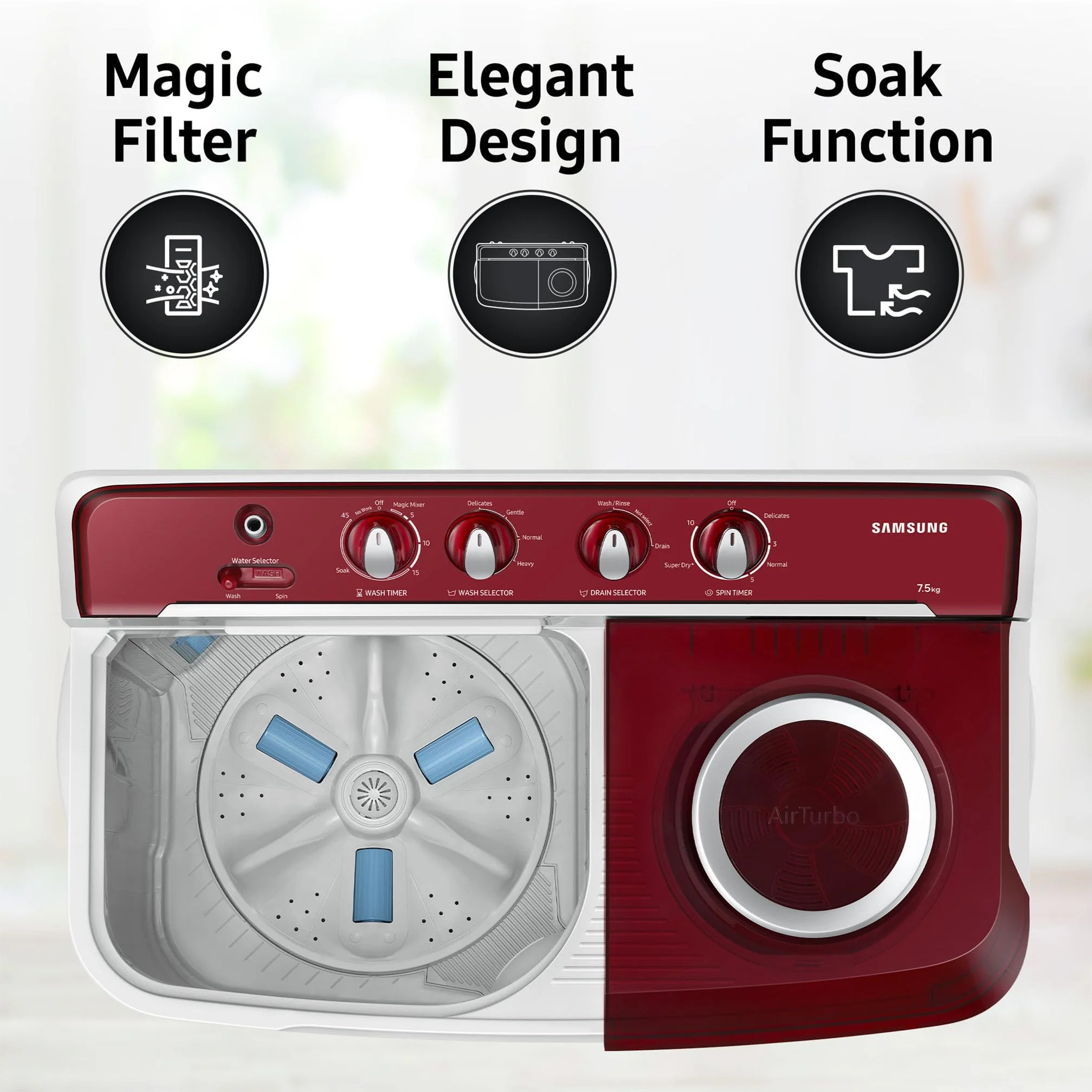 – Semi-Automatic top load washing maching: Economical, Low water and energy consumption – Capacity 7.5 kg: Suitable for large families | Water Pressure: (0.05~0.3MPa)(0.5~3.0kg.f/cm²) | Water Consumption : Refer to BEE label – Energy Star rating : 5 Star- Best in class efficiency | Energy Consumption: 0.0107 KWh/kg/cycle (For more information refer to BEE Label) – Warranty: 2 years comprehensive warranty on product and 5 Year Warranty on Wash Motor (T&C Apply) (Note: Brand Warranty can be availed using seller invoice) – Motor: 1300 RPM: Higher spin speeds helps in faster wash and drying. With its high speed and efficiency, it’s perfect for busy households or those who want to get laundry done quickly and effectively – Wash Programs: 4 Wash Programs – Delicates| Normal| Option List : Soak| Additional Cycle : Heavy, Gentle – Drum Type: PP Plastic, Pulsator : Hexa Storm Pulsator & Plastic Body – Air Turbo Drying – Reduce drying times by removing more water using the Air Turbo Drying System. – Key Performance Features: Hexa Storm Pulsator| Magic Filter – Additional Features: Rat Mesh Protection| Rust-proof Body| Caster Wheel (Note: User manual can be accessed from brand website)